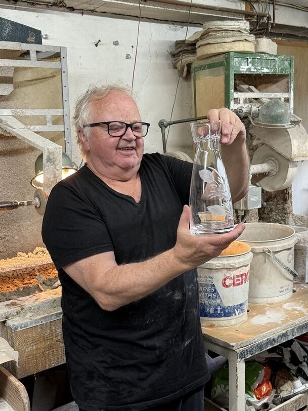 Nous arrivons chez l’artisan, dans une petite maison où le magasin est plein de verres gravés, et l’atelier, au dessous, a machines et établi de gravure. Le graveur grave des motifs floraux sur une carafe, avec une sûreté du geste et un savoir-faire remarquable, tout en nous donnant des explications avec sympathie. Il a commencé son métier en usine à 14 ans, s’est mis à son compte en 1963. On peut faire graver un nom sur un verre, il le fait volontiers et rapidement.