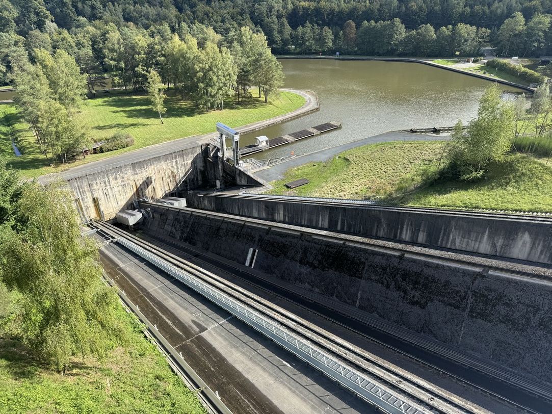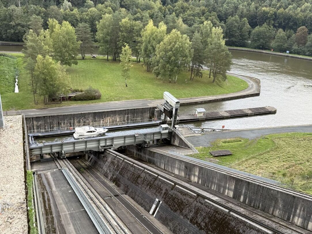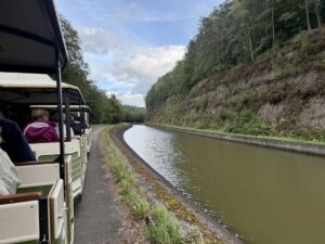Nous ne pouvons pas l’emprunter parce que le bateau est en panne, mais au moment de partir parcourir la vallée des éclusiers en petit train, un bateau s’annonce et la conductrice du train accepte gentiment de reculer son départ. Nous allons donc au-dessus du plan incliné : le bateau de plaisance arrive sur le canal, il entre dans le chariot-bac (perpendiculaire au canal) qui se déplace le long du plan de haut en bas, et le bateau, arrivé en bas, reprend sa navigation sur le canal. La manœuvre est impressionnante et en même temps sereine, le chariot-bac avec le bateau descend doucement le long du plan incliné, et nous remontons dans le petit train !