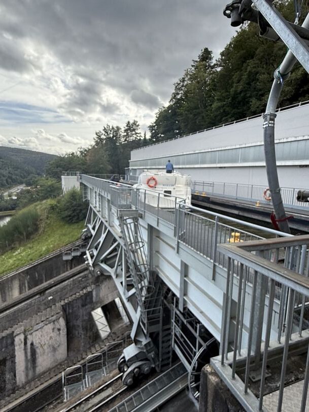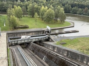 L’après-midi, c’est à nouveau Cédric qui nous accompagne, pour aller au plan incliné de Saint-Louis Arzviller. Il s’agit d’un ascenseur à bateaux construit sur le canal de la Marne au Rhin (314 km, 168 écluses). Dans « la vallée des éclusiers », il y avait 17 écluses pour franchir 100 m de dénivelé, ce qui prenait un jour de navigation pour les franchir ! Avec l’ascenseur, il faut maintenant 4 mn et on économise de l’eau puisque l’on en utilise plus que 40 m cube. Le plan incliné se situe au point culminant du dénivelé, au plus petit passage entre chaque écluse. Il a été construit entre 1964 et 1968 et mis en service en 1969. C’est un bac-écluse qui fonctionne comme une balance, qui avait été conçu pour deux bacs mais le trafic fluvial ayant diminué, on n’a pas construit le second bac. En effet, cette année par exemple, un seul bateau de marchandises l’a utilisé, il fonctionne pour la navigation de plaisance et les touristes. Il est géré par les Voies Navigables de France, (comme le canal du Midi), entre Saverne et Strasbourg, il y a 60 km, 30 écluses, deux jours de navigation. Le plan incliné a la même taille qu’une écluse.