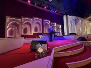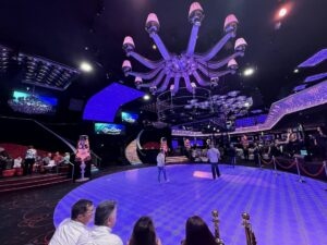 En effet le mercredi, en lieu et place de la visite de la ligne Maginot, nous partons moins tôt le matin (après quelques tours variés du lac au gré de chacun) en direction du Royal Palace ! Après la longue route habituelle en forêt le paysage se dégage, il est légèrement vallonné et les champs de cultures sont immenses. On traverse quelques villages alsaciens aux maisons à colombages, et on arrive à Kirrwiller. Le Royal Palace est un cabaret, décoration luxuriante à grand renfort de rose bonbon, et nous arrivons dans l’immense salle de restaurant, bon repas en musique bien sûr. Et puis l’après-midi c’est le spectacle, qui conte une histoire mi-écologiste, mi-merveilleuse, avec grands numéros de cabaret (danses aux costumes flamboyants) dans lesquels s’intercalent équilibristes, contorsionniste, trapézistes, dresseuse de perroquets. Après le spectacle, nous allons dans un salon de danse où le cabaret fête ses 45 ans et l’orchestre et les chanteurs permettent à tous de danser.
