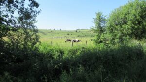 Vendredi 13 septembre : La météo qui nous a interdit de marcher mercredi nous le permet ce vendredi. Certes, il ne fait pas chaud, mais le soleil joue avec les nuages et le petit groupe qui a pu se libérer un autre jour se retrouve avec plaisir à Bromont-Lamothe. Nous traversons la route de Pontaumur et partons vers l’Ouest, par de grands chemins au milieu des prés où l’on verra partout des vaches blanches des Combrailles. Quand on bifurque vers le Sud, on traverse un ruisseau : le Rhône ! puis on voit l’autoroute de Bordeaux et bientôt, on passe au- dessous. Dès qu’on aperçoit une maison, c’est le moulin de Villemonteix. On arrive au bord d’une retenue dont l’eau actionne les machines d’une scierie dans le moulin, nous sommes accueillis par deux chiens et une oie qui, elle, préfère nous ignorer en allant sur l’étang. Le site est beau, calme, on en profite un moment avant de monter à Villemonteix et l’on retrouve les prés aux vaches blanches et surtout toute la chaîne des Dômes en face de nous, très nette sur sa face Ouest. Petites routes et chemins nous ramènent à Bromont-Lamothe, quel beau circuit, sans difficulté, et vivifiant pour la rentrée, merci Claude. |