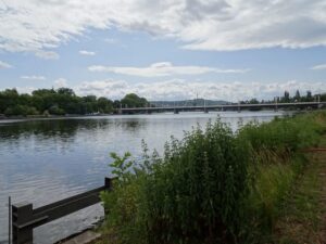 Jeudi 26 juin : Le temps est enfin moins orageux et un peu moins chaud, nous partons de bonne heure pour nous retrouver à Vichy tout près de l’Allier. Nous traversons le pont de Bellerive et longeons la rivière, bien aménagée en plan d’eau : installations sportives (des jeunes gens mettent en place les panneaux pour le prochain triathlon de Vichy), puis le golf, puis l’hippodrome. Ce sont les structures de prestige de la station thermale qui bordent ainsi la ville aux multiples parcs et aux belles maisons du XIX ème siècle. Nous arrivons au pont de l’Europe que nous traversons pour longer l’autre rive de la rivière, nous passons devant la Rotonde, la ville et ses parcs sont tout près et des enfants en sortie scolaire piquent-niquent près des installations nautiques. Nous retrouvons le pont de Bellerive, allons récupérer nos repas restés dans les glacières, et empruntons le chemin qui suit toujours l’Allier : théâtre d’été, restaurants de bord de l’eau, puis jardins, et enfin une aire de pique-nique dans la tranquillité des bois. Sur le retour, nous pouvons nous arrêter pour choisir café et glaces ! Les bords de la rivière étaient frais tout au long du parcours et la bonne humeur au rendez-vous du dernier jeudi de la saison, merci Bernard !