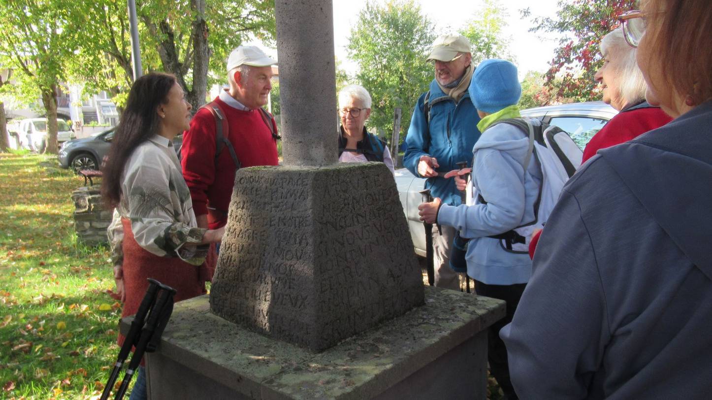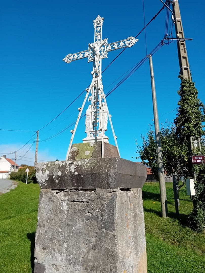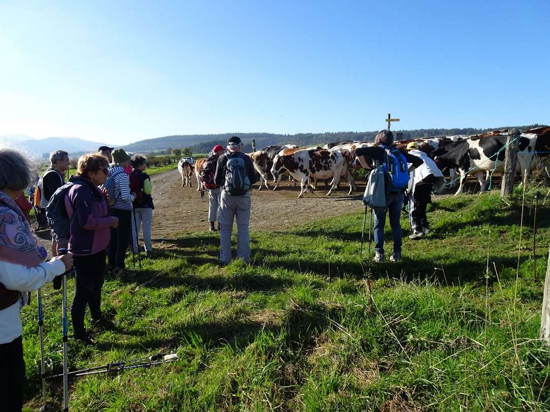 Dimanche 6 octobre : Après toutes les pluies, il fait beau… et nous sommes un petit groupe à Ludesse dont nous partons vers l’Est puis le Sud. Une petite côte d’abord, et le paysage s’élargit sur Plauzat, Saint-Maurice, la Sauvetat, Vic-le-Comte… Quand nous redescendons du plateau, nous passons devant le château de la Martre et puis nous sommes dans de grands chemins au centre du triangle dont les pointes sont Ludesse, Champeix, Montaigut : une campagne très verte encore avec de belles vaches, des bois, quelques buttes autour de nous, des noix sur le chemin, et nous arrivons à Saint-Julien. Sur la place, il y a une tour à clocheton et une fontaine d’eau potable, et puis nous prenons la route bordée des 105 caves creusées dans le talus. Nous arrivons rapidement près de Montaigut-le-Blanc, passons entre les deux parties du cimetière, nous sommes sur le GR du pays des Couzes. La petite route monte régulièrement, des ramasseurs de pommes sont dans un arbre au milieu d’un jardin plein de citrouilles, des chasseurs en grosses voitures sortent des chemins, et quand on arrive près d’une croix avec un bénitier, c’est déjà Ludesse. Après le château et l’huilerie des Fées, nous retrouvons le parking. C’est une bien jolie balade d’octobre, merci Claude. |