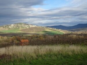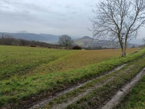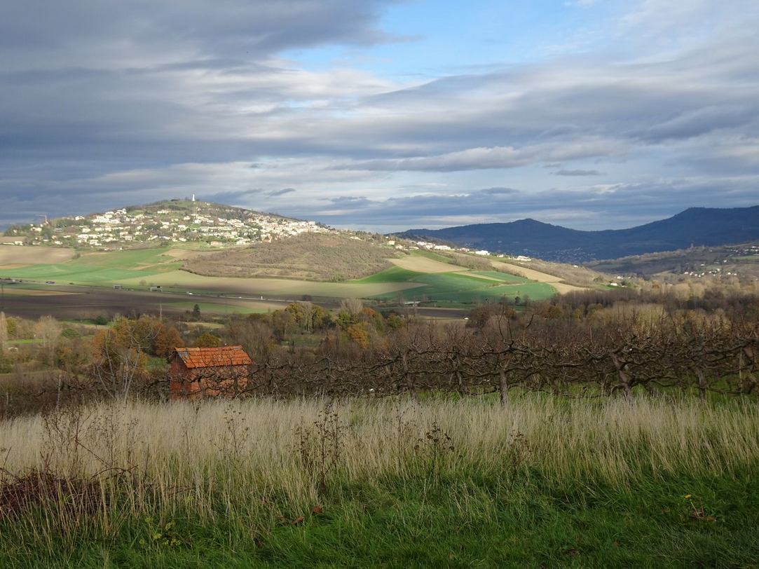 Mercredi 20 novembre : Le temps est couvert mais il ne doit pas pleuvoir… et quand on arrive près du stade de Lussat, où l’on peut se garer à l’abri, une petite pluie nous accueille ! Nous nous équipons et partons bravement ; la pluie s’arrête très vite et nous sommes dans l’immense plaine par les grands chemins qui quadrillent les champs de terre noire. Nous partons vers le Nord puis l’Est, apprenons que Lussat est connu pour ses gisements de lussatite, pierre opaline d’un blanc laiteux, trouvée quand on cherchait là du goudron. Nous arrivons au croisement où le Bedat fait un coude à 90 ° en recevant le ruisseau des Guelles, et nous suivons la rivière jusqu’à Épinet. Un beau pigeonnier est bien caché dans une propriété privée, on en voit le sommet et un peu la base à travers la haie. Nous revenons vers le Sud jusqu’au centre équestre où les poneys montés sont en manège, et retrouvons rapidement le stade de Lussat. La chaîne des Dômes est dans les nuages, le Puy de Dôme à peine visible (on est en novembre…), mais la Limagne est vaste autour de nous, merci Claude.
