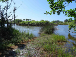 Lundi 16 juin, nous allons aborder un autre paysage, celui des marais. D’abord, tout proche du VVF, celui des marais de Mousterlin à partir de la plage du Grand Large. C’est un lieu humide donc ombragé, traversé par de grands chemins de promenade (à pied ou à vélo) mais surtout plein d’une végétation qui ne nous est pas habituelle, qui supporte le sel.