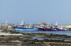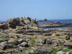 Nous longeons l’océan vers le Nord, arrêt à la chapelle Notre-Dame-de-la-Joie, édifiée en gratitude envers la Vierge qui a protégé les marins dans les tempêtes. Il faut dire que ces dernières sont violentes en ces lieux, en 1888 pendant une forte tempête, la mer franchissait le mur qui protège la chapelle, il faut remonter ce mur tous les trente ans… C’est le lieu d’un Pardon le 15 août. Nous arrivons au port de Saint-Guénolé où se trouvent hangars et pêcheries d’activités maritimes (dont de bonnes conserveries !) et nous continuons de longer la côte au-dessus des rochers de Saint-Guénolé, sculptés par la mer de formes bizarres qui alimentent force légendes, mais où se sont aussi déroulés des drames tant l’endroit est dangereux. Ce jour la mer est magnifiquement bleue, la marée montante fait de l’écume sur les récifs, les rochers ont des formes fantastiques, c’est un moment de beauté absolue. Et juste avant la plage de Pors Carn, une aire de pique-nique nous attend, d’où l’on voit la pointe de la Torche, bien connue des surfeurs. Un groupe d’enfants sont prêts pour une compétition sur l’eau…