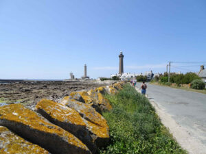 Nous revenons à Penmarc’h par les marais, et rejoignons le GR 34 appelé ici « GR du pays bigouden » qui nous permet d’arriver au phare d’Eckmühl par le Sud. Il est construit en kersantite, la roche magmatique de Kersanton (hameau au bord de la rade de Brest) facile à sculpter quand elle est extraite en filons mais qui devient ensuite très résistante aux éléments : c’est la pierre des calvaires bretons. À l’intérieur du phare, la montée de l’escalier est tapissé d’opaline, ce que vont vérifier quelques courageux qui grimpent les 307 marches car le phare est ouvert au public. D’autres se reposent de ce long trajet sans ombre mais tellement beau ! Et le soir au VVF, dîner crêpes !