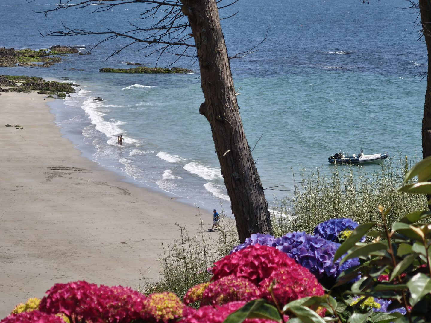 Pour aujourd’hui, ce sera jusqu’à Port-Manec’h et son phare, à l’embouchure de la rivière de Pont-Aven. Le ciel est parfaitement bleu, la mer montante de toutes couleurs de bleus et verts, la côte fleurie, la végétation de bord de mer luxuriante… Il fait chaud mais l’air de la mer est bienvenu et Serge nous détaille tous les îlots et lieux repérables depuis le sentier.