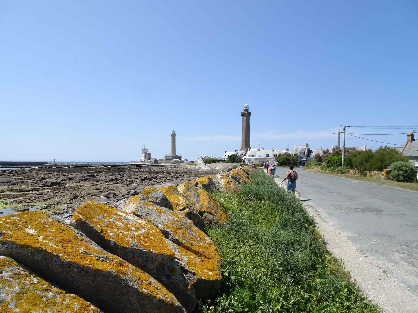 Le mardi 17 juin, cap vers l’Ouest, tout au bout de cette côte Sud de la péninsule bretonne : la pointe de Penmarc’h (prononcer : « Pin maar » Le mot signifie « tête de cheval »). Thomas nous conduit tout à la pointe, au pied du Phare d’Eckmülh. Il est impressionnant, haut de 65 m, 307 marches mènent à la lanterne qui fonctionne automatiquement par un éclat toutes les 5 secondes qui porte à 54 km en moyenne (le phare le plus puissant de Bretagne est celui d’Ouessant). Il a une histoire particulière, inauguré en 1897 par la veuve du général Davout. Celui-ci voulait le construire pour remplacer l’ancien phare plus rustique et modeste qui est encore à côté, comme le sémaphore qui surveille en permanence la circulation maritime. Le général Davout étant prince d’Eckmühl après les guerres napoléoniennes, il lui est dédié et porte ainsi ce nom… peu breton. Mais il s’agit de partir sur le GR 34, particulièrement beau à cet endroit, et le soleil et la chaleur sont toujours avec nous.