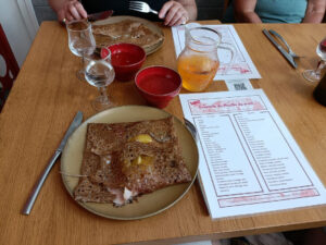Nous reprenons le car, passons sur le pont de Cornouaille, très haut au-dessus de l’Odet et d’où l’on voit les deux parties de Bénodet, de part et d’autre de l’anse de l’Odet. Un arrêt à la biscuiterie Garrec, magasin d’usine que l’on rejoint en longeant, derrière des vitres, les ateliers où se fabriquent crêpes, galettes kouign amanns et autres délices… Quelques achats bien sûr et nous repartons pour la crêperie « Chez Mimi ». Et là, un choix de crêpes salées ou sucrées et une belle organisation pour nous servir les crêpes choisies par chacun en un temps record pour notre grand groupe !