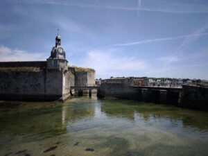 L’après-midi, Thomas nous conduit à Concarneau où nous nous donnons rendez-vous à l’entrée de la ville close, sous le porche du pont-levis. La ville close est dans un petit promontoire qui s’avance dans l’anse du Moros : Là encore, flânerie dans les rues pittoresques, jolies vues dans les ouvertures sur le port, le reste de la ville qui enserre la baie, et surtout quand on monte sur les remparts par de nombreux escaliers très raides. De là, la vue s’étend bien loin sur la mer et la côte, de la pointe du Cabellou au Cap-Coz… et à l’horizon. Mer toujours calme, bateaux, soleil.