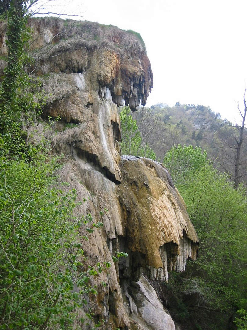 A l’émergence de ces sources (griffon), on observe des dépôts de carbonate de calcium souvent colorés en rouges par des hydroxydes de fer. Ces dépôts carbonatés s’appellent des travertins, surtout s’ils recouvrent des végétaux tels que des mousses, lichens etc… Ils forment parfois de magnifiques draperies comme à la source de la Tête de Lion.