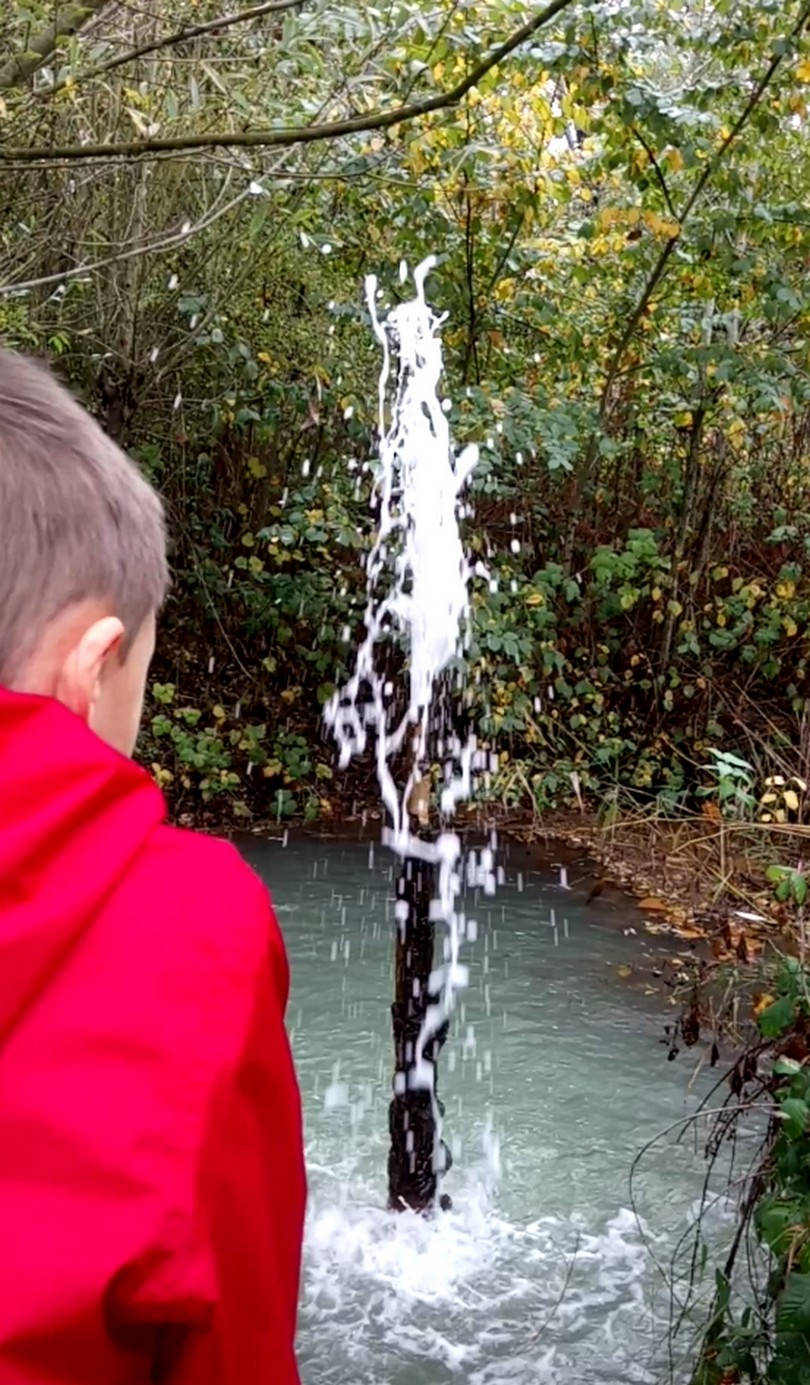 L’eau se présente dans un petit bassin aménagé avec une petit trou en son centre : elle se trouble légèrement et l’on entend une sorte de crachouillis ; puis un jet d’eau s’élève en une hauteur de 30 à 50 cm avant de retomber dans le petit tuyau. On explique ce phénomène par la présence d’une petite poche remplie d’eau + CO2 à la base du petit conduit. Le CO2 arrivant de façon continue, la pression finit par devenir assez forte pour que le tout soit expulsé brutalement. Il faut attendre que le réservoir se remplisse de nouveau pour que le phénomène se répète en moyenne toutes les 10 mn.