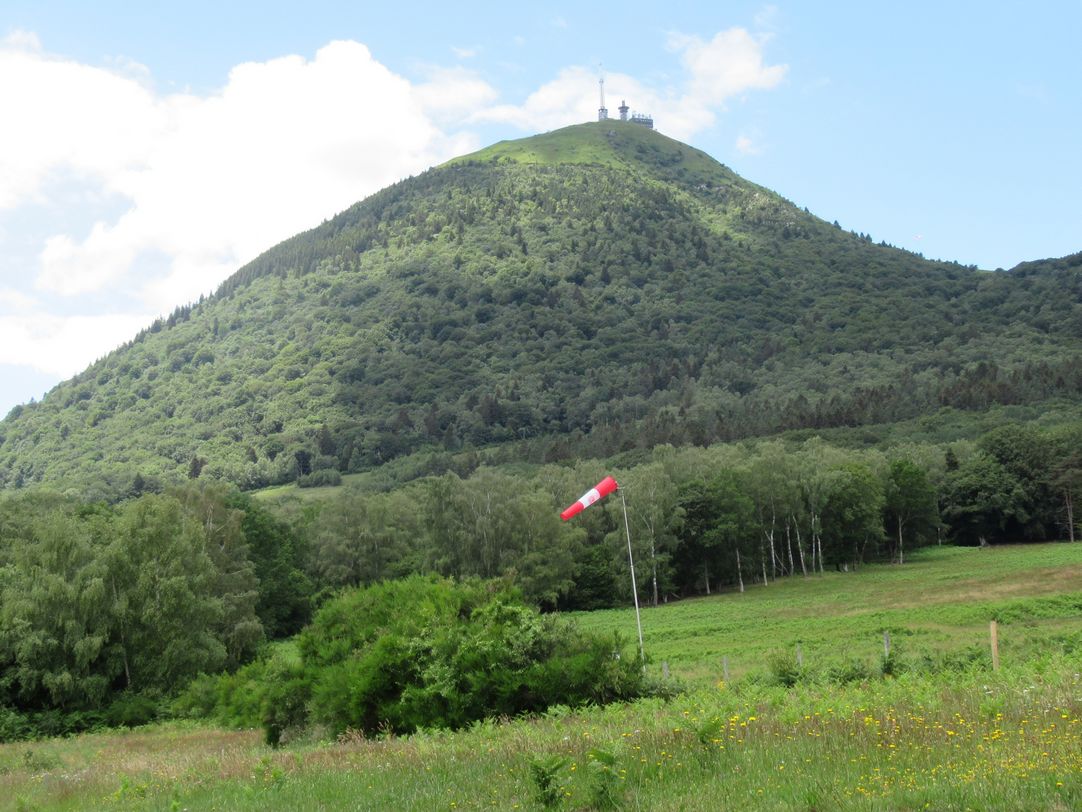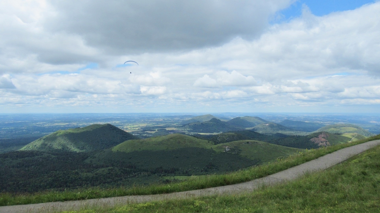 Pour moi le vertige n’existe pas, quand je suis sur des sommets, je m’approche toujours au maximum du vide. Donc là, je suis dans mon élément, je vais profiter d’un moment de pur bonheur hors du temps. Nous survolons dans un premier temps le sommet du Puy de Dôme avec les autres parapentistes s’apprêtant à décoller ou au contraire se posant, le temple de Mercure, l’antenne toute proche où je n’aimerais pas poser mes fesses, puis au loin la chaîne des puys : Côme, Suchet, Pariou, Cliersou, Goules, Chopine… et différentes vallées bien vertes à cette époque. Le vent nous obligera à survoler longtemps le même secteur mais j’en prends plein les yeux, j’éprouve des sensations uniques et très agréables.