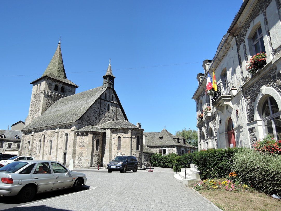 La belle et grande “Place du Monument” bordée d’arbres sous lesquels on peut stationner fait que l’on se sent tout de suite à l’aise dans cette petite ville de 2800 habitants. La pierre du pays souvent apparente, les nombreuses toitures couvertes d’ardoise ou de lauzes massives, les nombreux “chiens assis” qui surmontent les façades nous confirment que nous sommes bien dans le Cantal. La rue des écoles nous amène au pied du clocher de l’église St Georges dont le porche pavé de galets donne accès à une porte très ancienne du 13ème siècle. La nef à trois travées de style roman surprend par sa construction tout en belles pierres apparentes mais aussi par ses piliers de forme carrée qui supportent les voûtes. Au niveau du transept ou débouche la travée unique et profonde qui forme le choeur, on discerne dans la pénombre de curieux chapiteaux dont certains représentent des scènes guerrières. Derrière l’église s’ouvre la place Charles de Gaulle qui donne accès à l’Hôtel de ville magnifiquement fleuri et dont la construction récente respecte en tous points le style général de la ville.