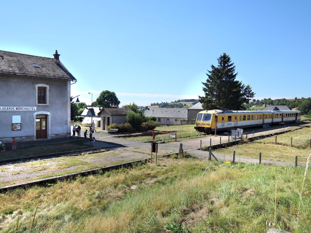 Entre l’espace Avèze et la fromagerie, se trouve la gare située sur l’ancienne ligne de Bort les Orgues à Neussargues, fermée par la SNCF en 1991. L’association des Chemins de Fer de la Haute Auvergne animée par une poignée de passionnés a repris la plus belle partie de cette ligne et y fait circuler un autorail touristique : le Gentiane Express qui fait l’aller retour jusqu’à Lugarde sur le plateau du Cézallier. Confortablement installés, nous allons, tout au long du parcours et dans une ambiance bon enfant, profiter de commentaires très intéressants sur l’histoire et les ouvrages d’art de cette voie ferrée de montagne, mais aussi sur le relief et les paysages d’estive traversés. Après le long tunnel de Lestempes, nous voici sur le viaduc en courbe de Barajol auprès duquel nous nous arrêterons et au milieu duquel nous nous rendrons à pied pour surplomber de 57 mètres la rivière. Nous imaginons l’activité passée des petites gares de St Amandin et de Lugarde. Ce charmant petit village typique se découvre au cours d’un arrêt de 3/4 d’heure. On peut y admirer la mairie, la maison du bailli, et la très ancienne église puis revenir tranquillement à la gare pour le retour vers Riom.