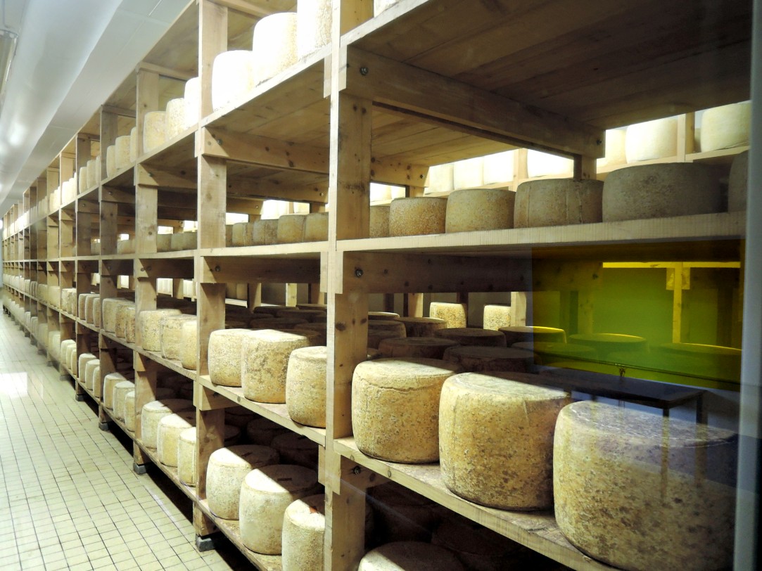 Située près de la route qui conduit à St Etienne de Chomeil, la société fromagère de Riom (groupe Lactalis) s’impose au visiteur par son importance et par le nombre de camions gros porteurs qui fréquentent ses quais d’expédition. Après une première laiterie dans les années 1900, Riom posséda des 1925 les premières caves réfrigérées du Cantal; on y fabriqua même la fameuse “vache qui rit”. Aujourd’hui, grâce aux 180 employés de l’établissement et à un millier d’éleveurs, ce sont 6500 tonnes par an de fromage laitier qui sortent des entrepôts. Aux appellations protégées (AOP) Cantal et Bleu d’auvergne, s’ajoutent le St Nectaire, le Salers et même les Fourmes. Le visiteur n’est pas autorisé à visiter les installations techniques, mais il nous est donné d’apercevoir un des entrepôts d’affinage et de profiter d’une intéressante vidéo qui explique les différences de fabrication des divers fromages. Le magasin de vente nous permet de goûter les excellents produits proposés à des prix corrects. La fête du Bleu d’Auvergne qui a lieu chaque année l’avant dernier week-end d’août maintient et illustre avec son copieux programme d’animations la longue tradition fromagère de Riom.