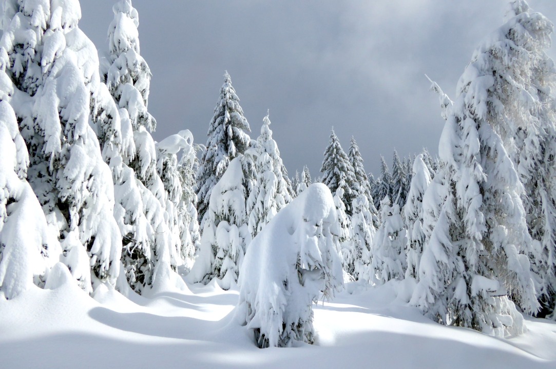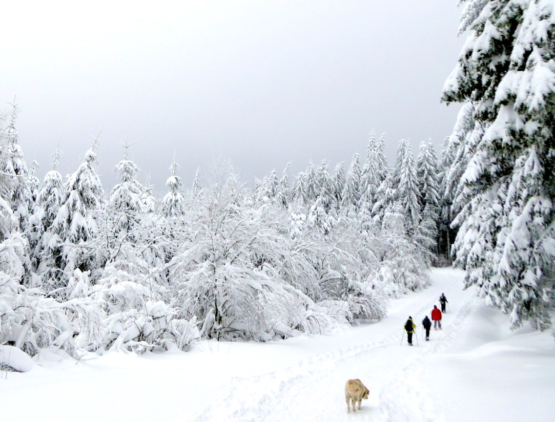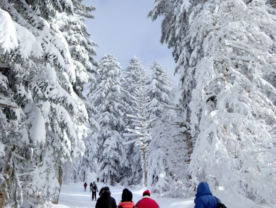 Après un trajet difficile du bus sur la route enneigée, nous voici sur le plateau de Charlannes, prêts, raquettes aux pieds pour caresser la poudreuse à la conquête des grands espaces de ce massif du Sancy, si cher à nos coeurs, pour un parcours de 10 km au milieu de paysages superbes ! Un épais manteau de neige fraîche immaculée avait transformé le paysage, donnant parfois aux arbres des formes inattendues et féeriques, tandis que de lourdes chandelles s’accrochaient aux rochers.