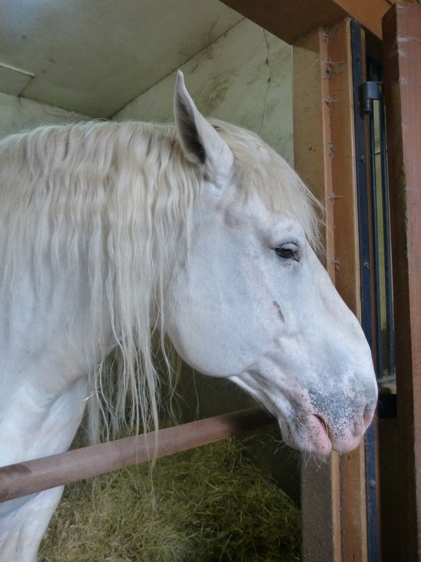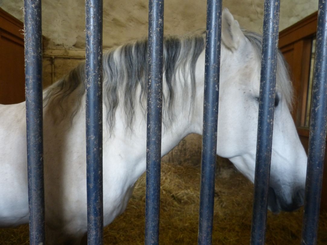 L’idée ce ces haras venait de Louis XIV et de Colbert : il fallait des chevaux pour l’armée, élevés dans une région où le foin est bon. On a choisi la Normandie (haras du Pin) et le Limousin. Le cheval limousin était un bon cheval de guerre, mais on a cessé de l’élever après les guerres napoléoniennes qui ont tué 12000 chevaux. Dans les années 1980, il y a eu fusion avec Saumur, et Pompadour a conservé la jumenterie de Chignac. Elle élève 70 chevaux dont 20 poulinières ce qui permet une vingtaine de naissances par an, les poulains restent avec leur mère dans les prés, sont sevrés à 7 ou 8 mois après un pré-sevrage d’un mois, sont identifiés et réservés aux courses et aux spectacles pédestres. Nous allons voir quelques chevaux dans les écuries.