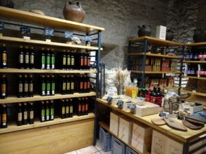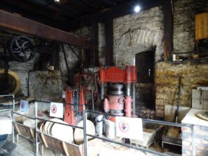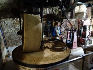 Certes, les méthodes ont un peu évolué. Pour récolter les noix, une machine fait vibrer doucement les arbres pour faire tomber les noix mûres, une autre les ramasse. En septembre-octobre, il faut les laver, les sécher, (il faut qu’elles perdent 80 % de leur eau) les casser, puis on les « dénoisille » à la main. Le moulin date de 1870, actionné à l’époque par traction animale. La grosse meule écrase les cerneaux ; elle est maintenant mue par l’électricité, la meule sur les cerneaux donne une pâte qu’il faut faire cuire dans une grande poêle en fonte sur un four alimenté… par des coquilles de noix ! Selon la température de torréfaction, on obtient six sortes d’huile, de la plus douce et fruitée à 95 ° à la plus corsée, pendant une demi-heure. La pâte est mise dans une presse hydraulique d’où s’écoule l’huile, gardée dans des citernes en inox pendant trois semaines avant d’être mise en bouteilles. 30 kg de cerneaux donnent 15 l d’huile, il faut donc 2 kg de cerneaux pour un litre. Le résidu forme une pâte très dense que l’on presse en tourteau, que l’on passe sous la meule pour obtenir la poudre de noix. Quand on presse des noisettes, on a de la poudre de noisette, on utilise ces poudres en pâtisserie… et l’on donne des résidus de tourteau aux brebis et aux vaches, qui aiment bien cela !