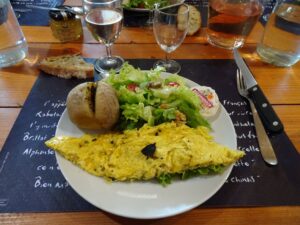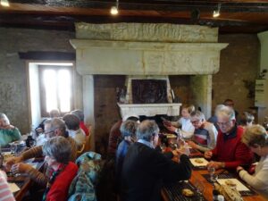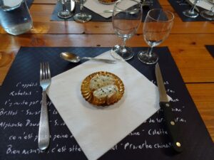 L’apéritif est à base de vin blanc avec du jus de truffe, le pâté de porc « cul noir » bien traditionnel, l’omelette aux truffes délicieuse et le Rocamadour avec du miel à la truffe est étonnant…
