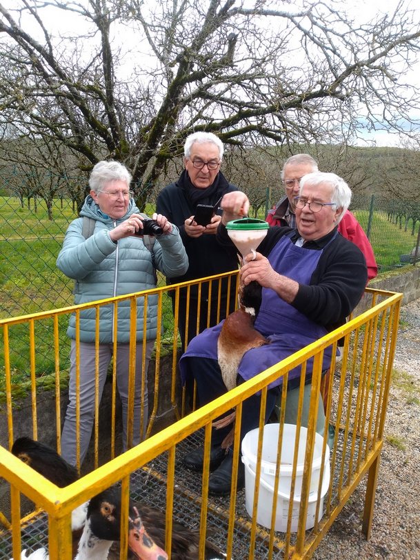 Nous sommes tous au rendez-vous malgré l’heure matinale, y compris le car avec Jean-Michel que nous retrouvons avec plaisir après plusieurs sorties qui avaient dû être annulées pendant la période d’épidémie. Nous partons sur l’ancienne RN 89 (le soleil levant éclaire l’herbe très verte des prés, les arbres en fleurs partout et le Sancy qui a encore un tout petit peu de neige) pour rejoindre l’A 89 en direction de la Corrèze : le paysage est de plus en plus forestier, les viaducs surplombent de grandes vallées boisées, vers Égletons il y a même un peu de brouillard. À l’aire de Corrèze, pause petit-déjeûner et nous continuons vers le Lot jusqu’à Souillac, en plein Quercy, dans les paysages riants des bords de Dordogne. À la sortie de la ville, nous arrivons à la ferme de Grezelade, où l’ancien propriétaire nous accueille et nous fait un rapide historique de cette exploitation familiale dont il a laissé la direction à sa fille, mais qui est l’héritière d’une tradition ancienne d’éleveurs. C’est que la région pratique depuis toujours ces méthodes de gavage de canards pour le foie gras, mais aussi la production de truffes, de noix : on sait que c’est un haut lieu de gastronomie !
