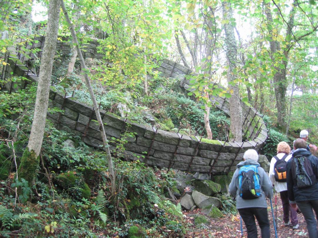 Tout près de là, en pleine forêt, un immense anneau d’une dizaine de mètres de diamètre, calé dans la pente qui surplombe le chemin, enserre les hêtres aux couleurs chatoyantes de l’automne ! Quelques mètres encore, “une rue” apparaît en contrebas.