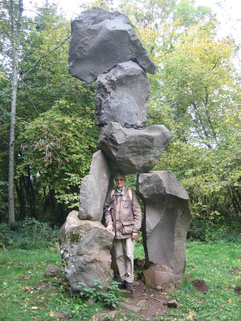 Ce parcours est situé dans Les Combrailles, à l’ouest de la chaîne des Puys. Nous partons de Chapdes-Beaufort et nous engageons dans un sous-bois. Quelques bornes sculptées en bas relief de signes énigmatiques jalonnent le sentier. Une petite côte, et surprise ! Des colonnes tournoient dans une prairie… nous flânons près de cette sculpture étonnante.