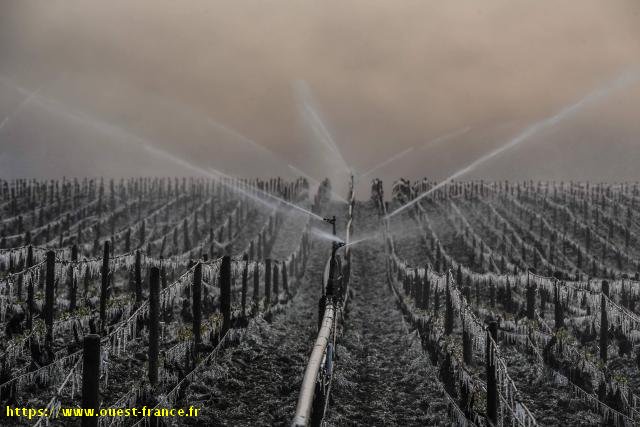 l’aspersion qui consiste à asperger les ceps avec de l’eau. Ainsi les bourgeons sont pris dans une poche de glace sans que l’eau qu’ils contiennent ne gèle. L’on appelle cela le phénomène de surfusion. Cette technique est délicate, car le glaçon ne doit pas dégeler trop vite. Ainsi il faut arroser les parcelles jusqu’à ce que la température redevienne positive. L’aspersion est donc continue.