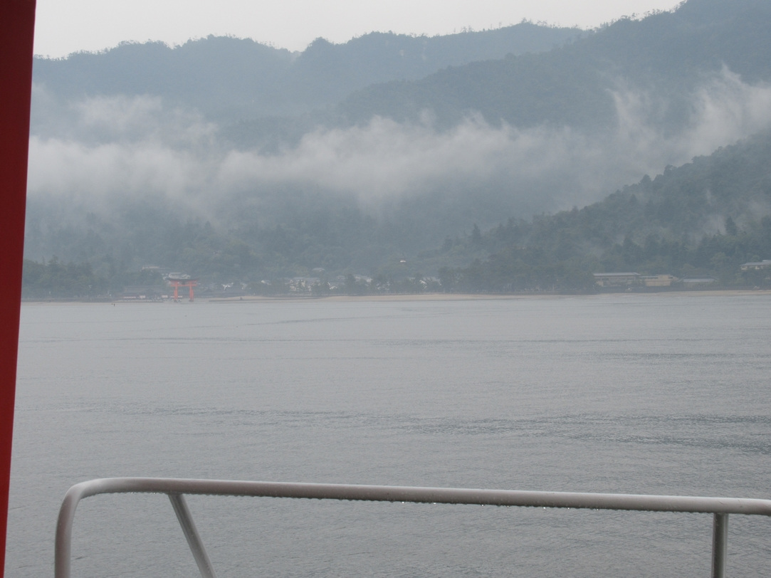 1h 30 de trajet dans un Shinkansen immaculé jusqu’à Hiroshima, puis 15 mn dans un train JR. La pluie commence juste avant l‘arrivée… Transfert vers le ferry ; nous nous équipons des kways et couvre-sacs…La pluie chaude et forte nous frappe jusqu’à la gare du ferry… Nous embarquons en direction de Miyajima, île sacrée du shintoïsme, célèbre pour le torii “flottant” du sanctuaire d’Itsukushima, portail qui se dresse au milieu de la mer, et qui symbolise la frontière entre monde profane et monde sacré.