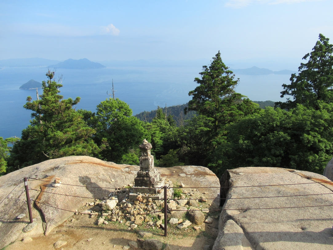 La vue sur la Mer Intérieure et ses îles est incroyable. Panorama à 360 ! Malgré une légère brume de chaleur, on aperçoit les montagnes de Shikoku, et la petite île en diamant !