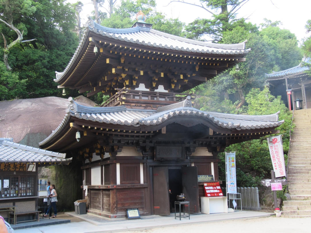 Jusqu’au sommet, cinq temples ; les japonais (nombreux) y font leurs dévotions, rituels rapides et bruyants ! le Reika Do où brûle la flamme éternelle (elle est là depuis 1 200 ans), le Sankido, seul temple au Japon où l’on vénère des démons, Kannon Do et Monjyu Do (le premier accueille les prières pour un avoir un accouchement facile et le deuxième pour une réussite scolaire), Dainichi Do (temple gardien du sanctuaire Itsukushima)…