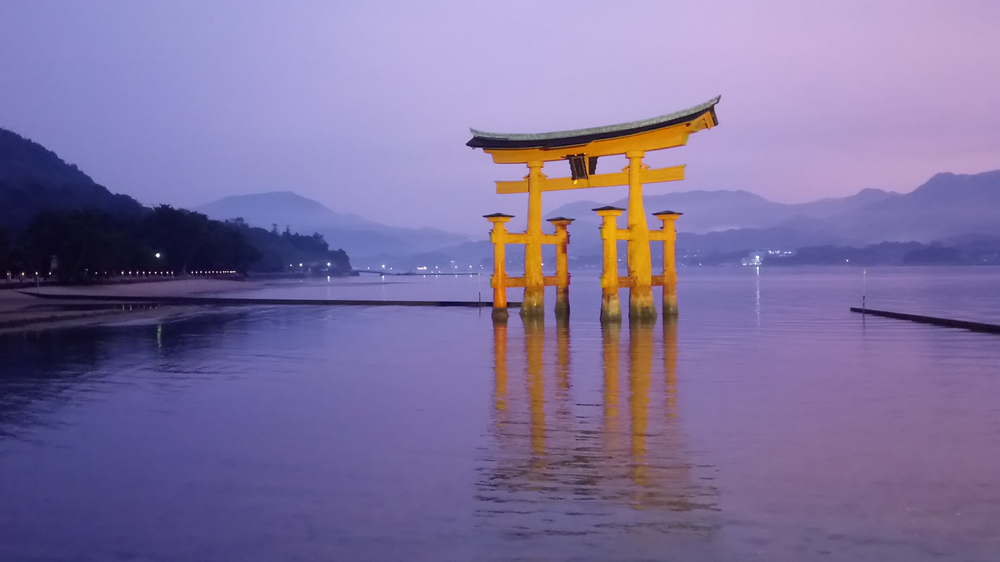 Nous profitons de la marée encore assez basse pour aller jusqu’au torii, admirer cette construction monumentale qui se dresse face à la mer…avant de nous installer sur le ponton du sanctuaire et assister à la montée des eaux jusqu’au coucher de soleil. La silhouette du torii se détache en ombre chinoise sur le ciel mauve et doré et semble flotter : Un moment magique ! Délicieuse attente jusqu’à l’illumination de nuit du sanctuaire, quand le torii devient doré !