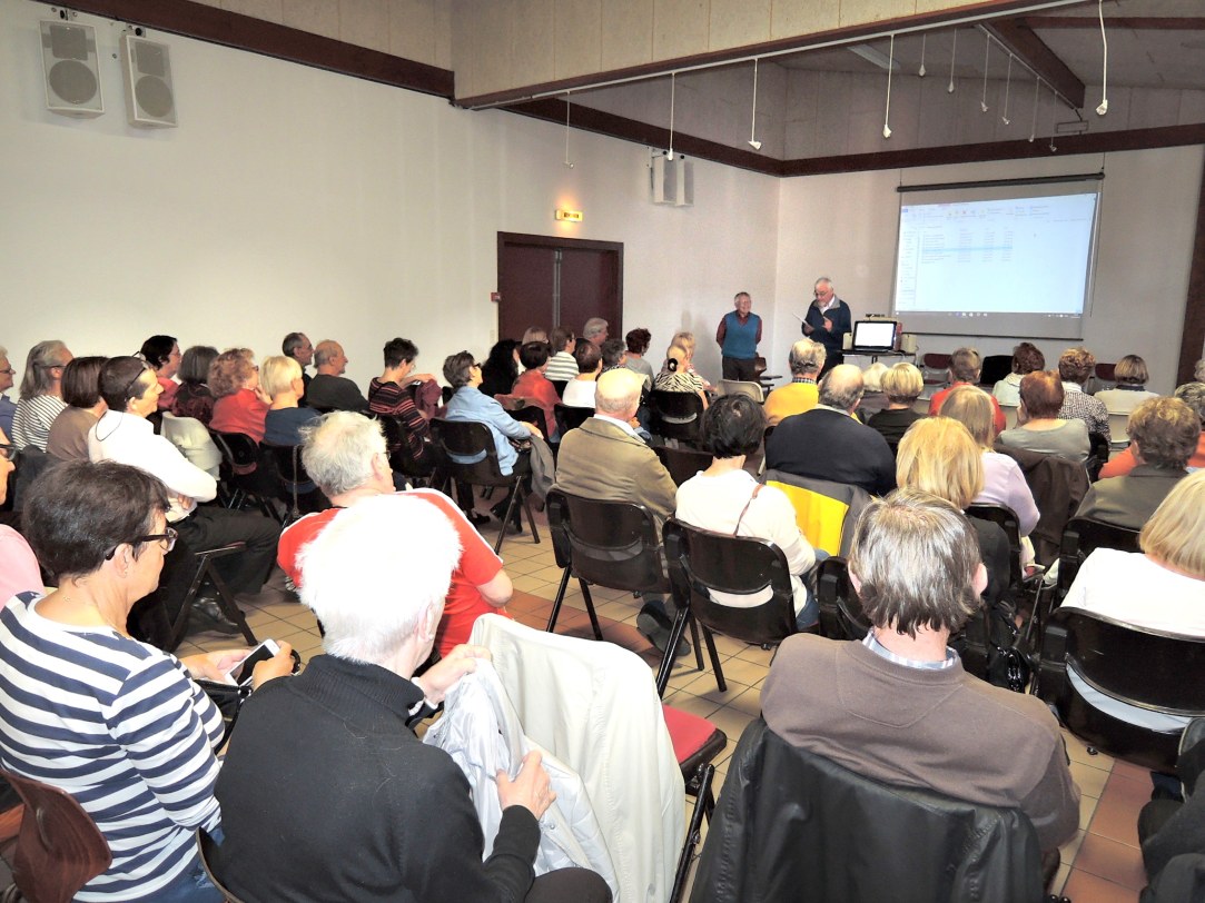 C’est près de 70 adhérents qui sont venus remplir la salle 2 de l’Espace Culture pour notre séance diaporamas annuelle. Une première partie nous a permis de revivre en images les randonnées et sorties du 1er semestre 2015, le voyage à Rochefort en Terre et l’étape espagnole Burgos – Astorga du chemin de St Jacques parcourue par Alain et ses coéquipiers. Est ensuite arrivé l’entracte près du bar, ou chacun a pu se rafraîchir d’un verre de cidre et retrouver des amis vus récemment mais aussi parfois, non rencontrés depuis longtemps.
