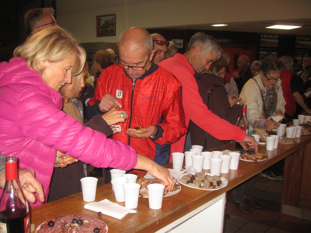 Au retour de la randonnée proposée par Claude ce mercredi 23 novembre, le groupe et son accompagnateur ont rejoint l’ECC, où les adhérents de l’association avaient été conviés par CBN pour déguster le beaujolais nouveau. Ils étaient nombreux au rendez-vous, heureux de passer un bon moment entre amis… A en croire les connaisseurs, la saveur de cette cuvée 2016 est fruitée et agréable ! Des assiettes de charcuteries, du bon pain, du fromage pour ceux qui voulaient grignoter, tout était là dans un buffet très copieux! Merci à tous ceux qui ont préparé et aidé au service pour faire de cette dégustation une belle réussite !