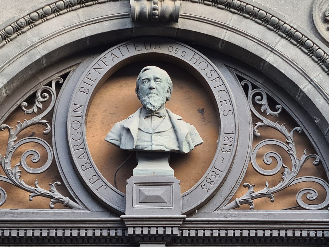 2°) Sur quelle maison peut-on contempler cet imposant buste de Jean-Baptiste Bargoin, pharmacien, qui a permis grâce à ses dons d’édifier le musée qui porte son nom ?