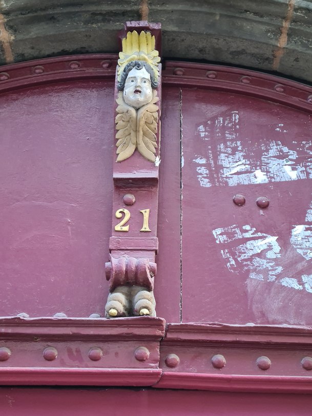 4°) En haut de cette porte, ce drôle de personnage avec plumes au dessus de la tête et des pieds d’aigle veille sur les entrées/sorties. Mais où exactement ?