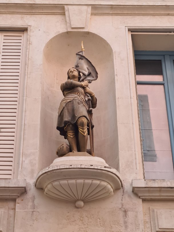 6°) Une Jeanne d’Arc, brandissant son drapeau, juchée sur une coquille vous surprend dans cette rue tranquille. Où faudra-t-il vous rendre pour la voir ?