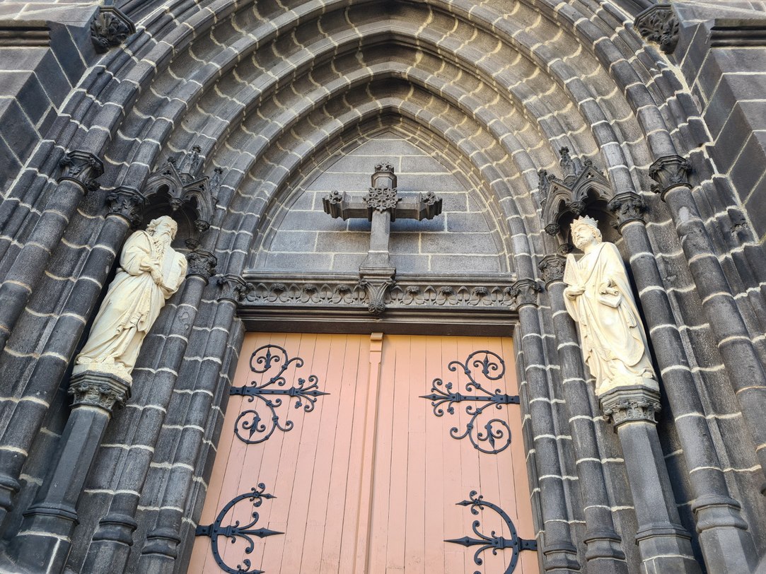 12°) Ce porche avec les statues de Moïse et David appartient à une petite église qui fut construite au 19ème siècle en pierre de Volvic et de style gothique. Saurez-vous trouver son nom et son endroit ?