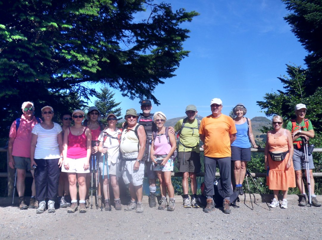 Pleins d’entrain, nous repartons gaiement. Les monts du Sancy apparaissent. Le soleil est fort ! Nous espérons un peu d’ombre. Nous continuons sur un chemin facile : quelques petits œillets d’un rose intense sur le bord, mais, dans les prés, l’herbe est jaune et les gentianes souffrent de la sécheresse !