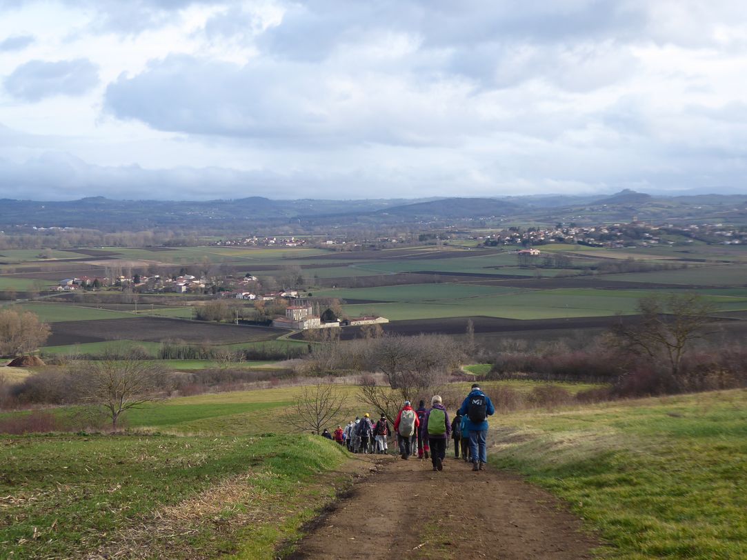 Mercredi 29 janvier : Nous partons de Moissat… Bas, mais traversons le Nord de Moissat… Haut, pour prendre les grands chemins entre les immenses champs de culture de Limagne, vers le Nord d’abord jusqu’aux Charles, puis le Nord-Ouest. Nous passons au-dessus de la voie ferrée (voie unique) et nous sommes au pied du puy de Courcourt dont la tour domine la plaine et le gros bourg de Seychalles. Nous revenons vers le Sud, juste en face de la falaise où se niche le château de Ravel. Le temps maussade nous a pourtant épargné la pluie, même si la terre colle aux chaussures, les lointains sont dans les nuages mais on devine tous les Dômes et l’air est vif malgré la température peu hivernale. C’est une bonne marche en pleine campagne, la grande plaine nous donne toujours l’occasion de respirer, merci Claude !