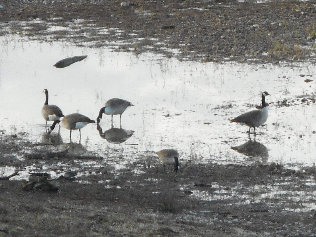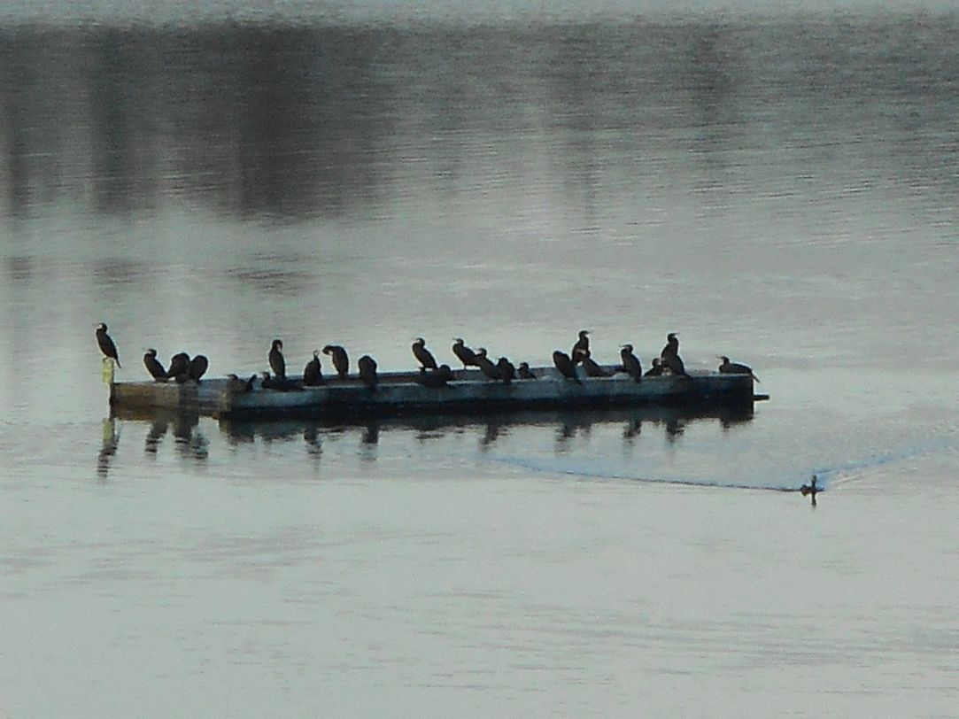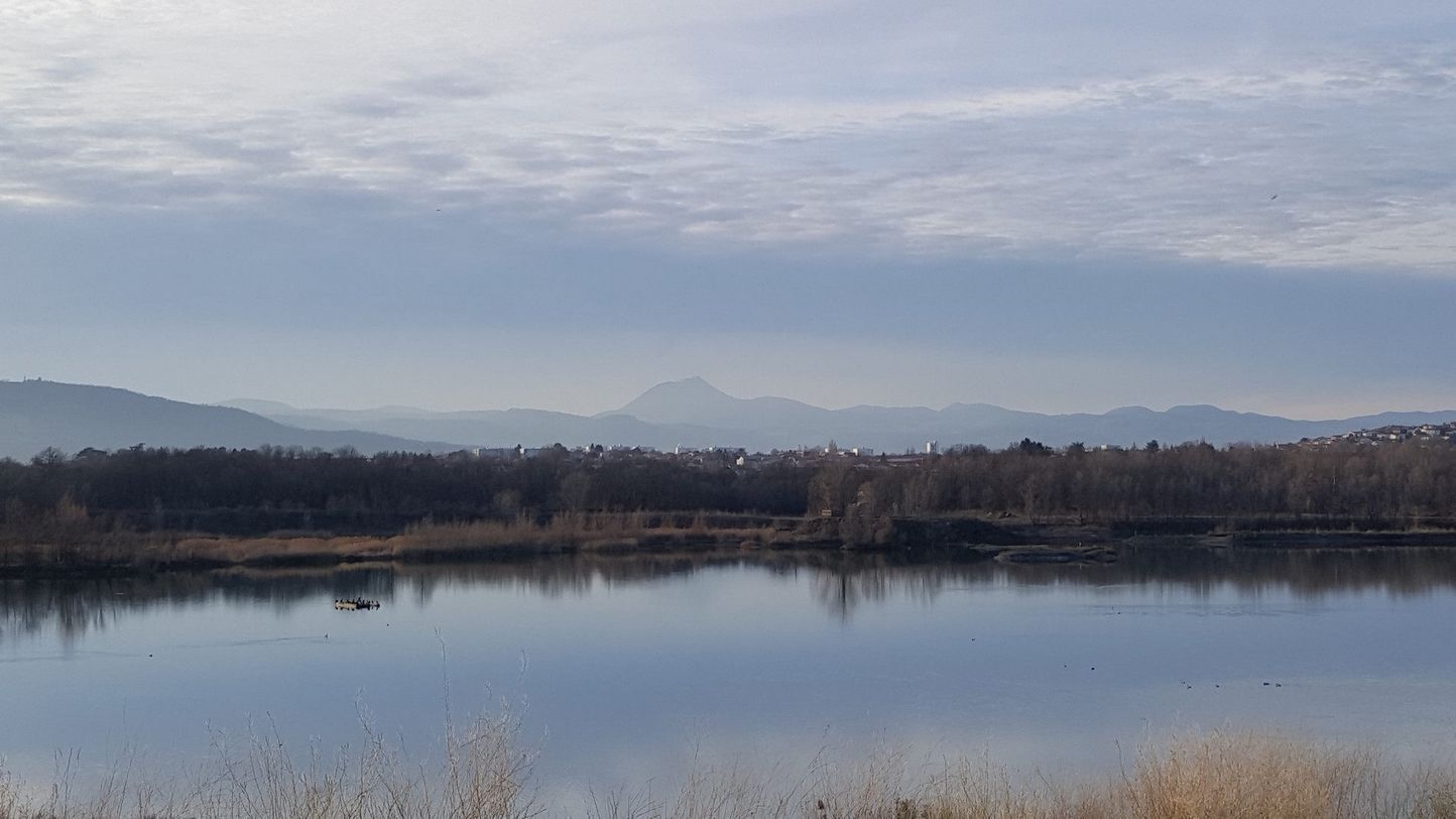 Nous retrouvons ensuite le grand bassin et la falaise aux hirondelles, avec la chaine des puys et le PDD en toile de fond. Ici, les oies bernaches cherchent leur nourriture sur les berges ; des cormorans sont installés sur un radeau ancré au milieu d’un bassin, des hérons s’activent à la pêche…et c’est le retour sur Pérignat tout proche.