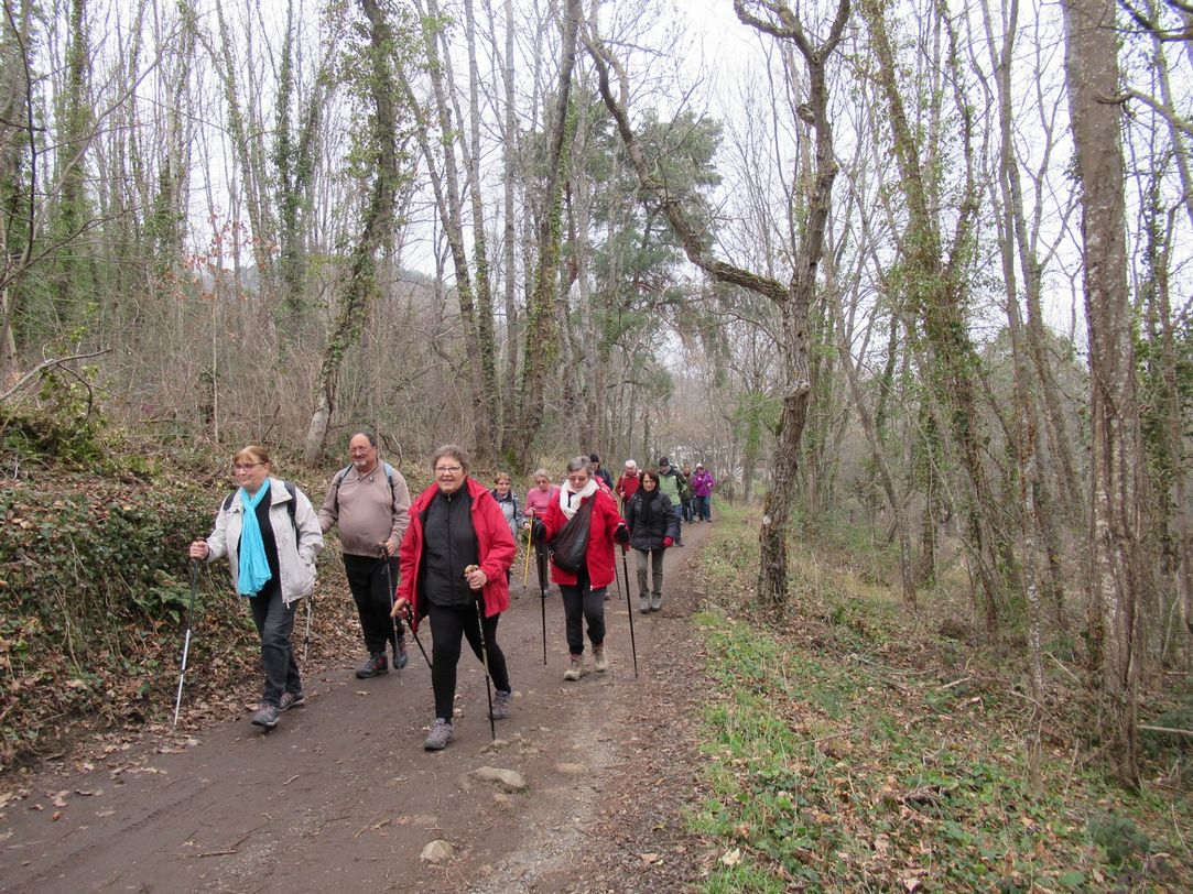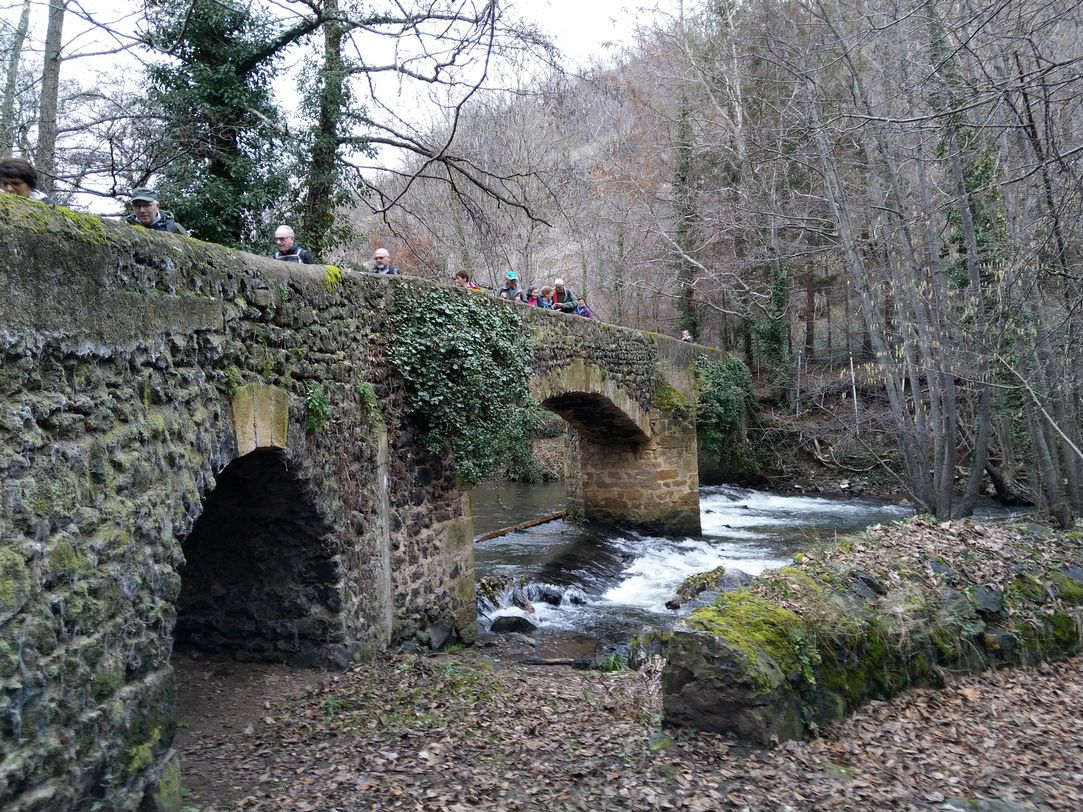 Mercredi 8 janvier : À l’entrée de Chadeleuf, nous rejoignons le village pittoresque pour monter doucement vers le Sud puis revenir sur la Ronzière. En face de nous, une butte avec un petit château, et plus bas, des étangs jusqu’à la crête d’où l’on voit Neschers sur le versant opposé de la Couze Chambon. Nous descendons pour rejoindre la ville, traverser la Couze sur un vieux pont à culées (interdit de trotter !!), passer devant un mur habillé de portes et fenêtres en trompe l’œil, et grimper par un raidillon sur le plateau au-dessus de Plauzat. Nous redescendons dans le bois en passant devant une grotte d’où l’on extrayait la pierre ponce, puis le long de la rivière, rapide et claire, que nous traversons à nouveau sur un petit pont de pierre à peine de la largeur d’un âne ! Nous remontons dans la ville et grimpons à nouveau pour retrouver le versant qui abrite Chadeleuf. C’est un beau circuit, paysager, riche du patrimoine des deux villages de caractère dans une vallée encaissée, merci Claude !