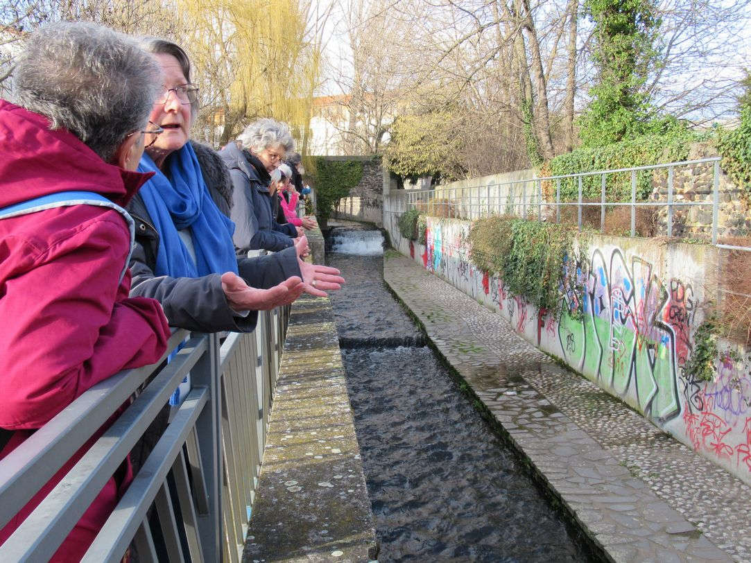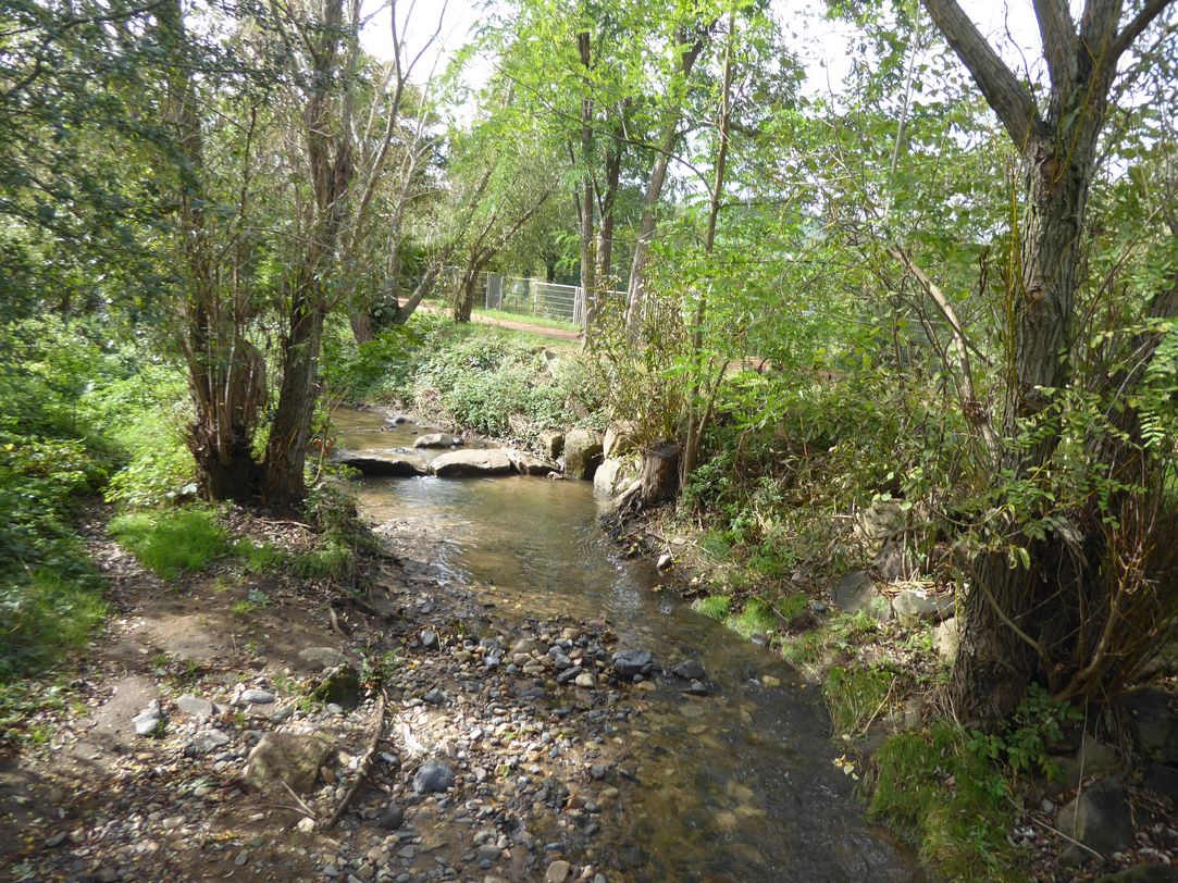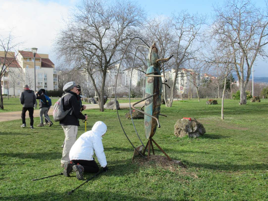 Nous étions 11 qui pensions être courageux en affrontant le mauvais temps, mais il a été tout à fait agréable. Départ du parking de Botanic, par le Chemin Vert, direction Ceyrat ; nous remontons l’Artière jusqu’au stade de Beaumont, où se réunissent les deux branches ceyratoises de la rivière (Artière de Ceyrat et Artière de Boisséjour) ; peu après, changement de commune, franchissement (en dessus) de l’Artière de Ceyrat et (en dessous) de la 4 voies que nous entendions gronder derrière les arbres.