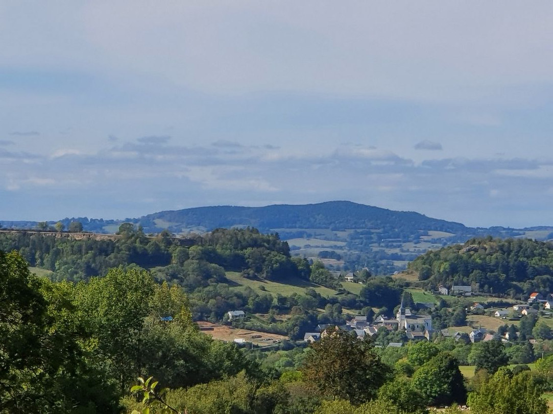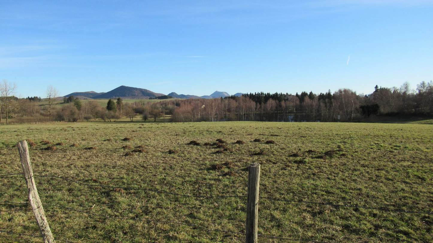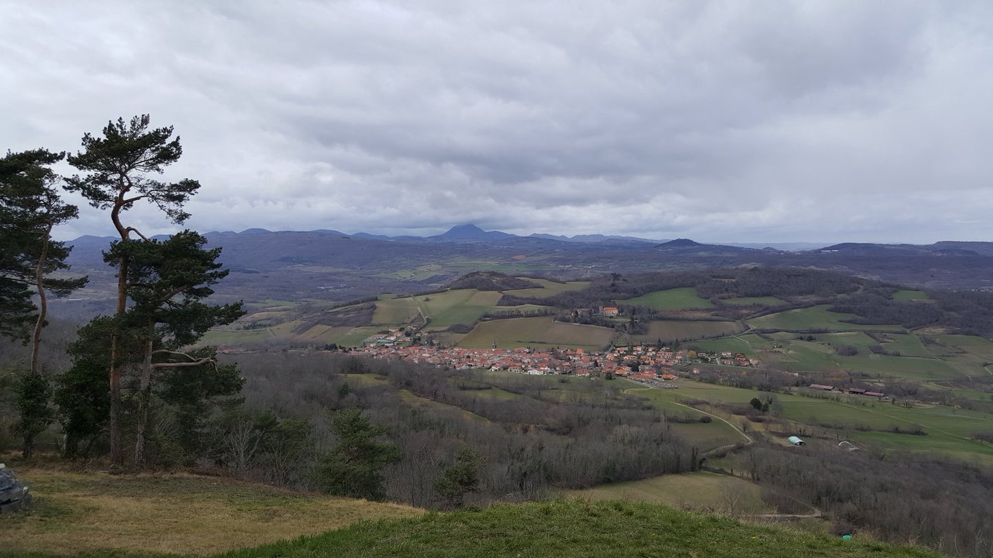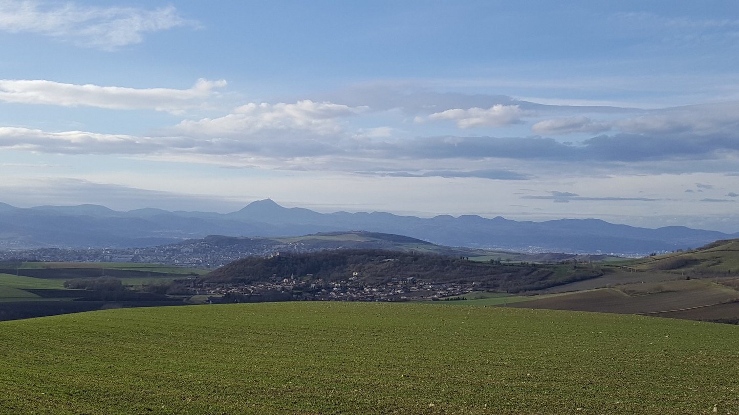 Dès le début de la descente s’ouvre un panorama à 180° sur tout le Lembron : Gignat, Bergonne ; loin, en face de nous : Vodable, Solignat et le pic d’Ysson, plus près, Antoingt, Mareugheol et Villeneuve-Lembron ; partout des vallons aux pentes cultivées de vignes et aux sommets occupés de villages ; le fond de la vallée est une mosaïque de terres riches et cultivées.