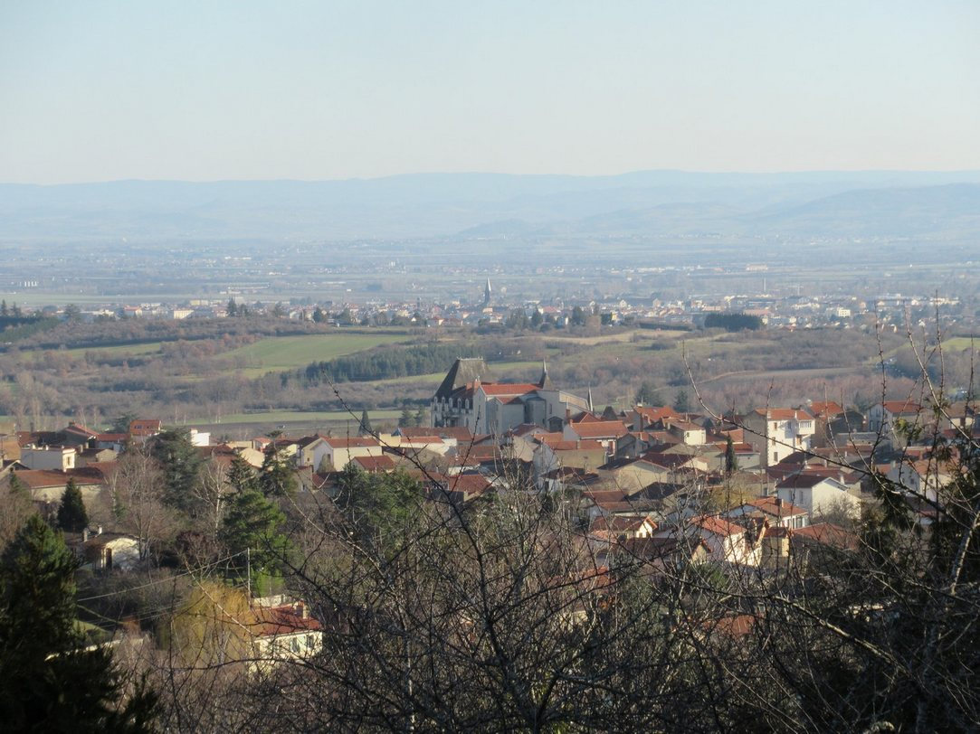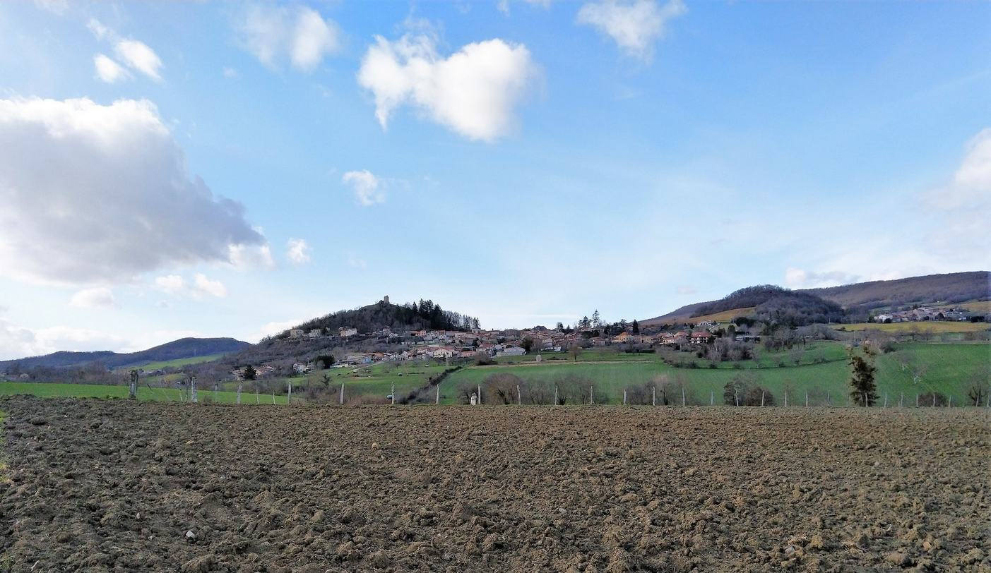 Mercredi 12 février : Nous partons de Boudes et montons sur un large chemin de terre. Bientôt en face de nous, le château de Chalus et une vue étendue : Saint-Germain-Lembron au fond, plus loin la butte de Nonette et le Livradois.