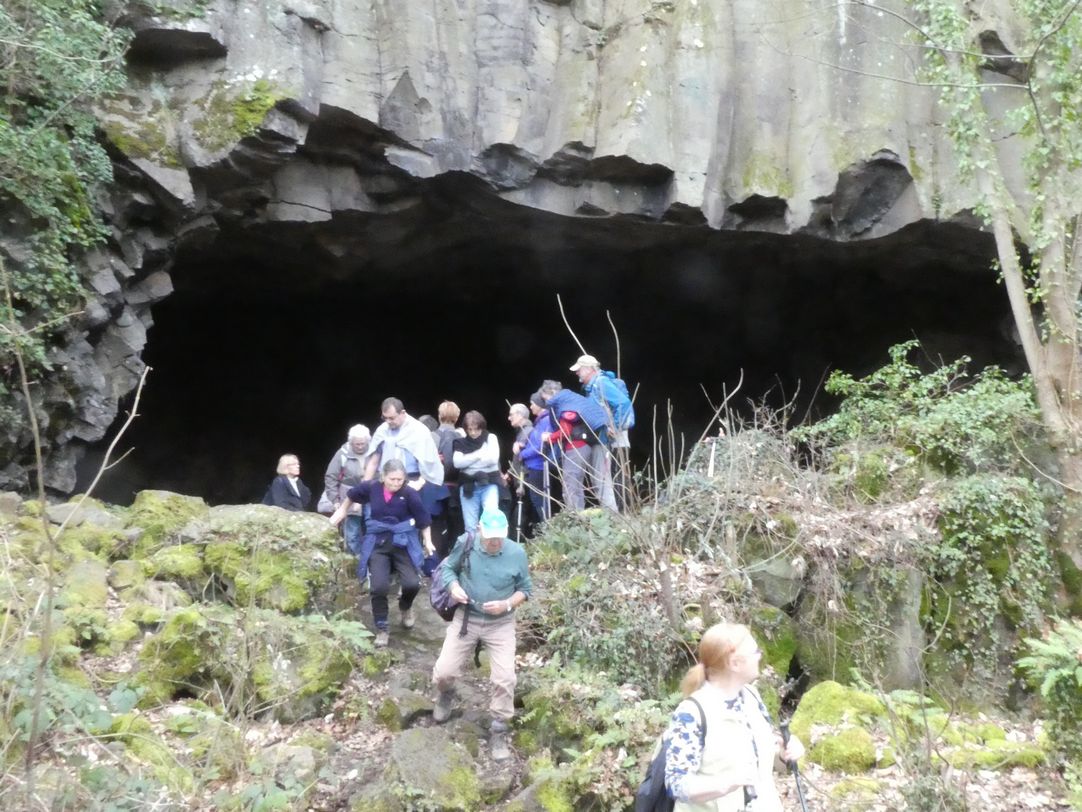 Ce volcanisme est très antérieur (Tertiaire, Miocène, environ 20M d’années) à celui de la chaine des Puys (Quaternaire). Nous avons observé au-dessus de la grotte une belle prismation du basalte dû au refroidissement du magma.