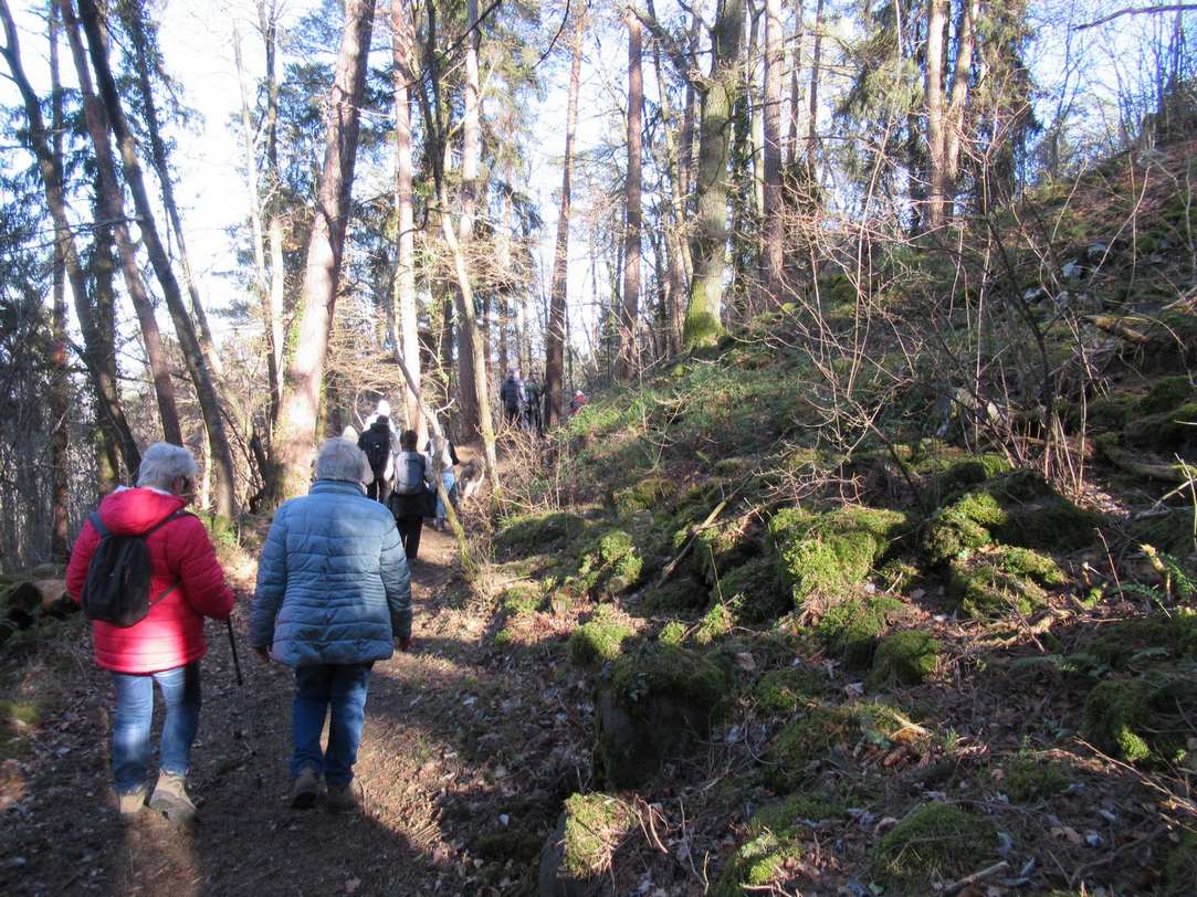Après avoir emprunté un sentier un peu raide à travers la forêt, nous arrivons au pied de la coulée de basalte de la Montagne Percée (692m). Martine nous donne des explications sur sa formation.