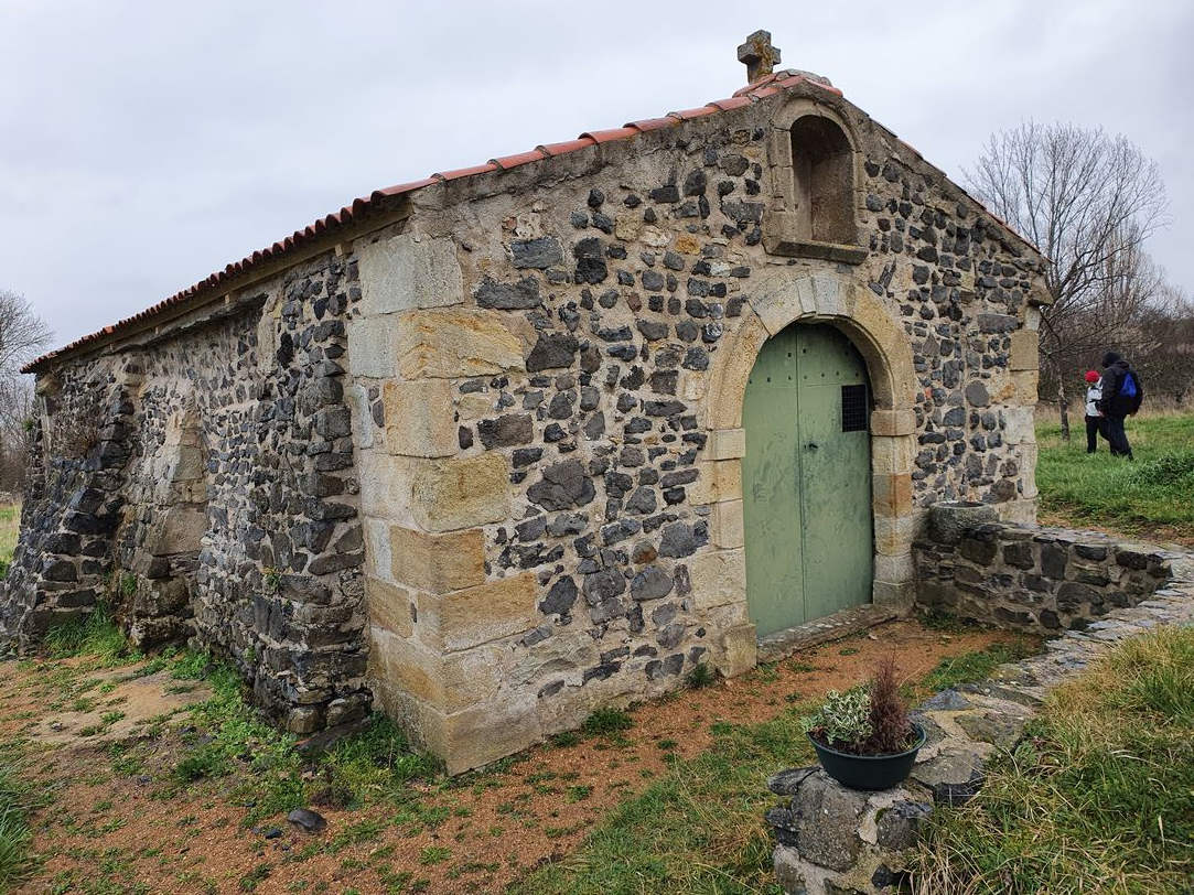 Mercredi 4 mars : Nous partons de St Amant-Tallende par le vieux pont gothique sur la Monne. Les côteaux de cette vallée où coulent Veyre et Monne sont dédiés à la pomme depuis le 18èmes, et beaucoup de vergers sont maintenant bio. C’est quand nous approchons de Tallende que le chemin monte progressivement le long des vastes terres agricoles, dominé par le Puy de St Sandoux avec à son pied, le village de St Sandoux. Un peu avant d’y arriver, Claude nous fait entrer dans un « verger à vocation pégagogique » ; pour y voir…la chapelle Notre-Dame-des-Près, plantée parmi de nombreuses variétés de pommiers !