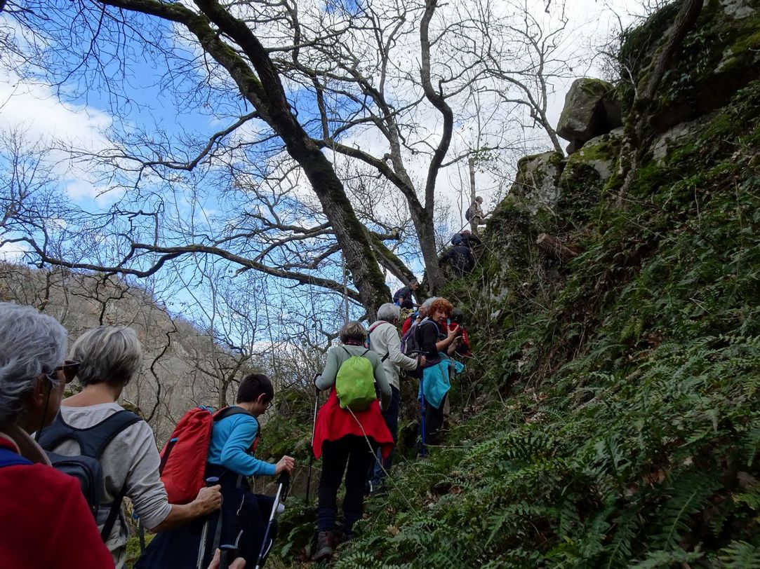 Mercredi 11 mars : le départ se fait au pied de la butte de Montaigut le Blanc ; le chemin longe d’abord la Couze Chambon, au fond de ses gorges dont l’entrée est surveillée par la tour de Rognon, seul reste d’un château du XIIème à vocation défensive ! Nous prenons vite un peu de hauteur pour gagner le « sentier de la Gaillarde », qui ramène vers Montaigut, à flanc de versant, alternant les passages entre les chaos rocheux, sous les troncs d’arbres barrant le parcours, les descentes glissantes sur les feuilles humides, et … point d’orgue…la montée d’une échelle ! Nous sommes nombreux, en file indienne, avec souvent une petite attente à chaque obstacle : il nous a fallu presque 1 heure pour parcourir 5 km…Nous poursuivons en montée sur le « circuit du bal des fées », jusqu’à déboucher sur un plateau : prés occupés par des Salers, terrains agricoles avec une vue sur le Sancy enneigé et brillant au soleil, aux portes des premières maisons de Reignat. Contraste saisissant de cette ouverture sur toute la vallée de l’Allier depuis Buron jusqu’à La Sauvetat, après le parcours sauvage du début de la marche !
